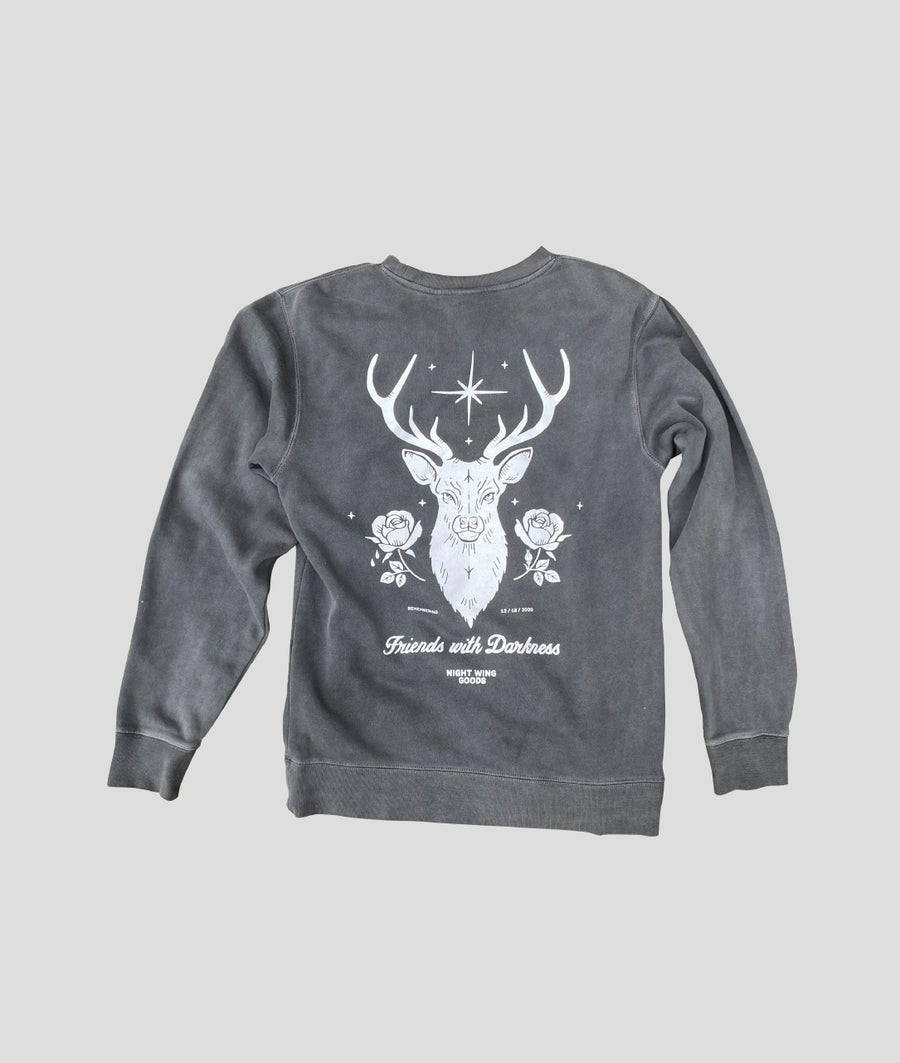 Inspired by a sacred relationship with the dark and death featuring our stag illustration from The Bone Keeper candle. Friends with Darkness. For those of us who are drawn to the mystery of night and don't turn away from those curiosities. Our super-fan customers might know what the inscribed date represents... a secret we can share that represents great meaning. Are you friends with Darkness?