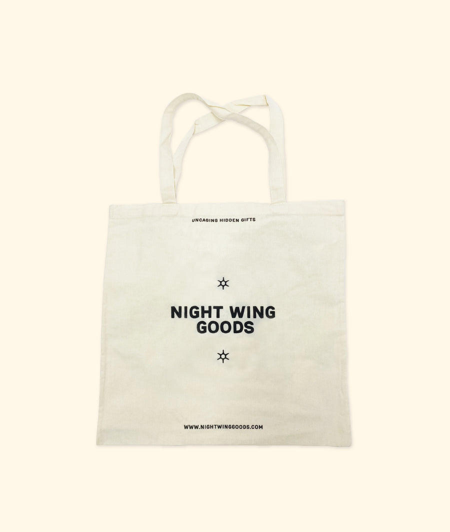 100% Organic Cotton Night Wing Goods Tote Bag branded with water-based inks